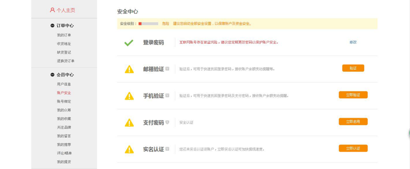 您可以登陆“账户安全”通过邮箱验证、手机验证、支付密码、实名认证来提高账户的安全等级。