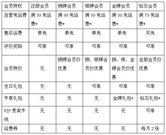 *除注册会员外,每一个会员等级的有效期均为一年,以获得该等级起,开始计算。在有效期内随着用户的消费情况,会员的等级会随之升、降或保持不变。