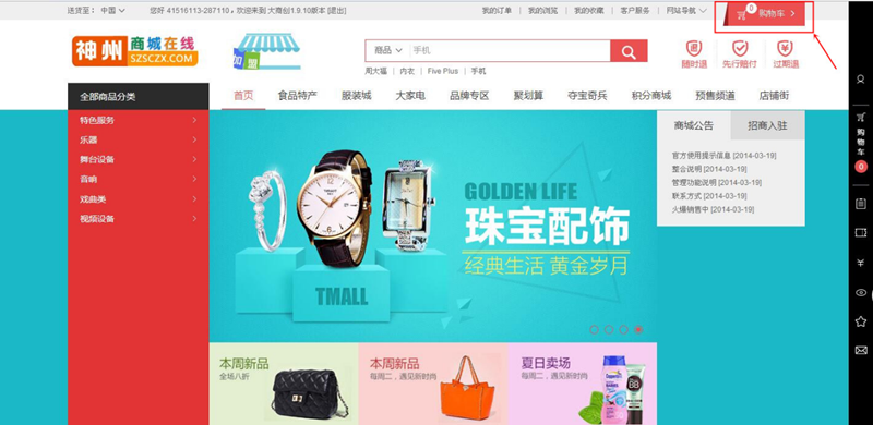 将商品加入购物车后可在神州商城在线首页,右上角点击【我的购物车】即可进入购物车查询、删除商品。(如下图)