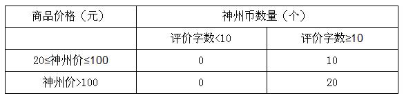 会员评价获得神州币的数量:神州商城在线的商品售价高于或等于20元时,用户在订单(虚拟商品除外)完成3个月内对商品进行有效评价(用户评价字数须应在10个以上)将享受10-20个神州币回馈。其中,商品售价高于等于20元且低于100元,用户评价成功后回馈10个神州币;商品售价高于等于100元,用户评价成功后回馈20个神州币。