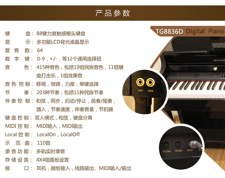 商品名称:吟飞电钢琴TG-8836D重锤88键电子钢琴数码钢琴正品TG8836升级