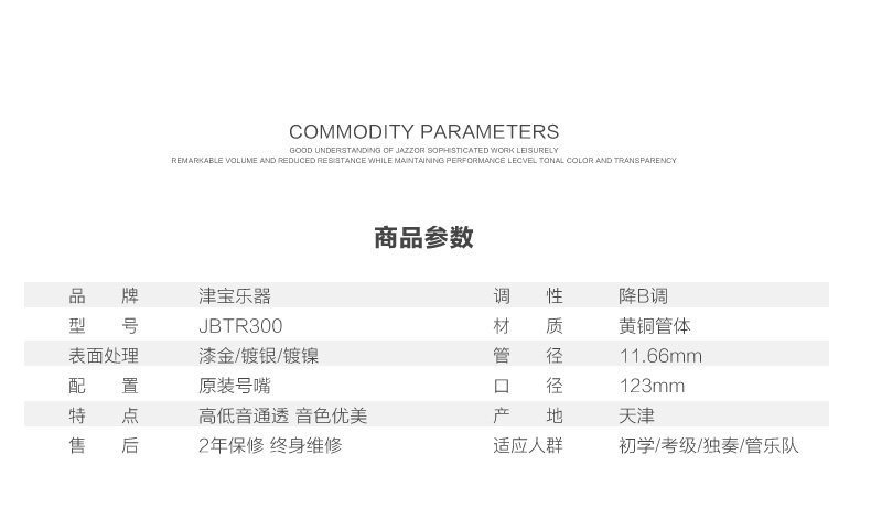 商品名称:小号乐器 专业津宝JBTR-300小号厂家直销 金色银色 初学 降B调