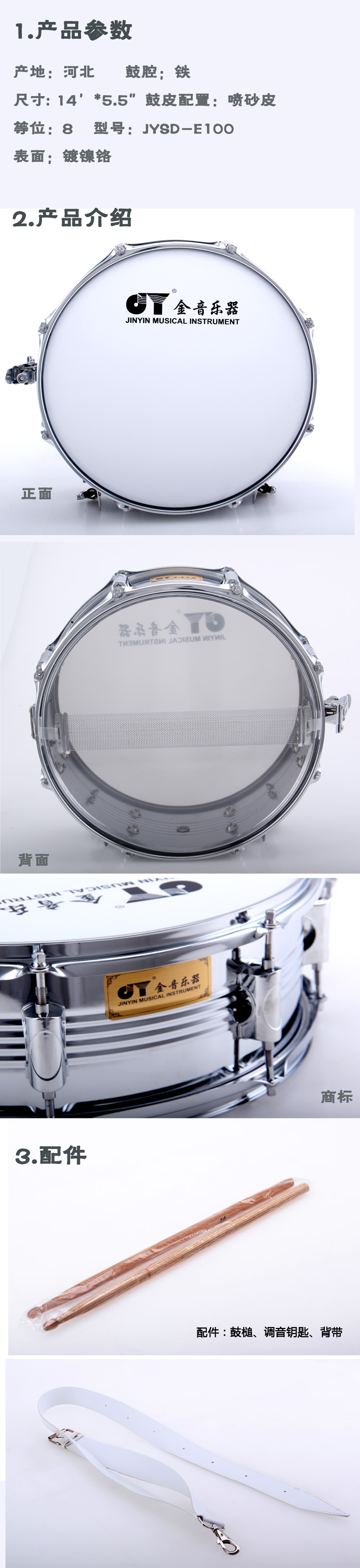 商品名称:金音乐器 小军鼓 铁腔 14吋 JYSD-E100 唯一官方自营 防伪查询