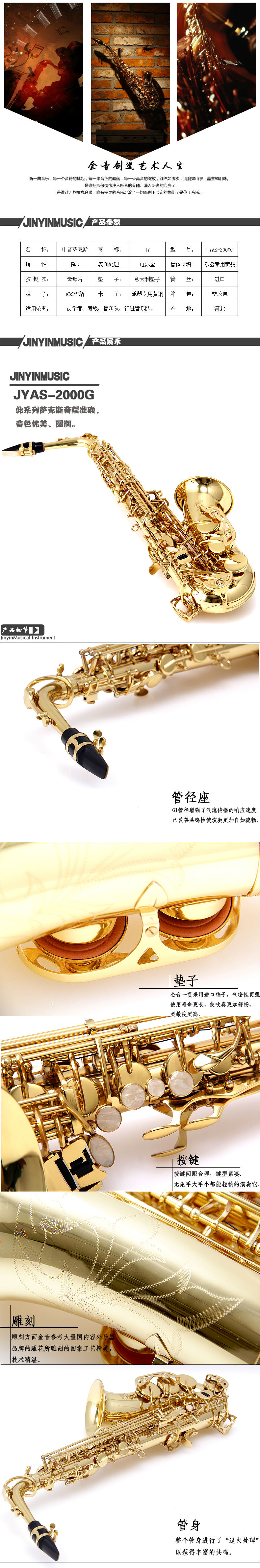 商品名称:金音乐器 中音萨克斯 降E调 JYAS-2000G电泳金 厂家直营 防伪查询