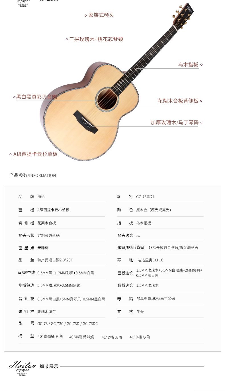商品名称:HAILUN海伦吉他 花梨木合板初学者自学练习表演专用正品GC-73系列