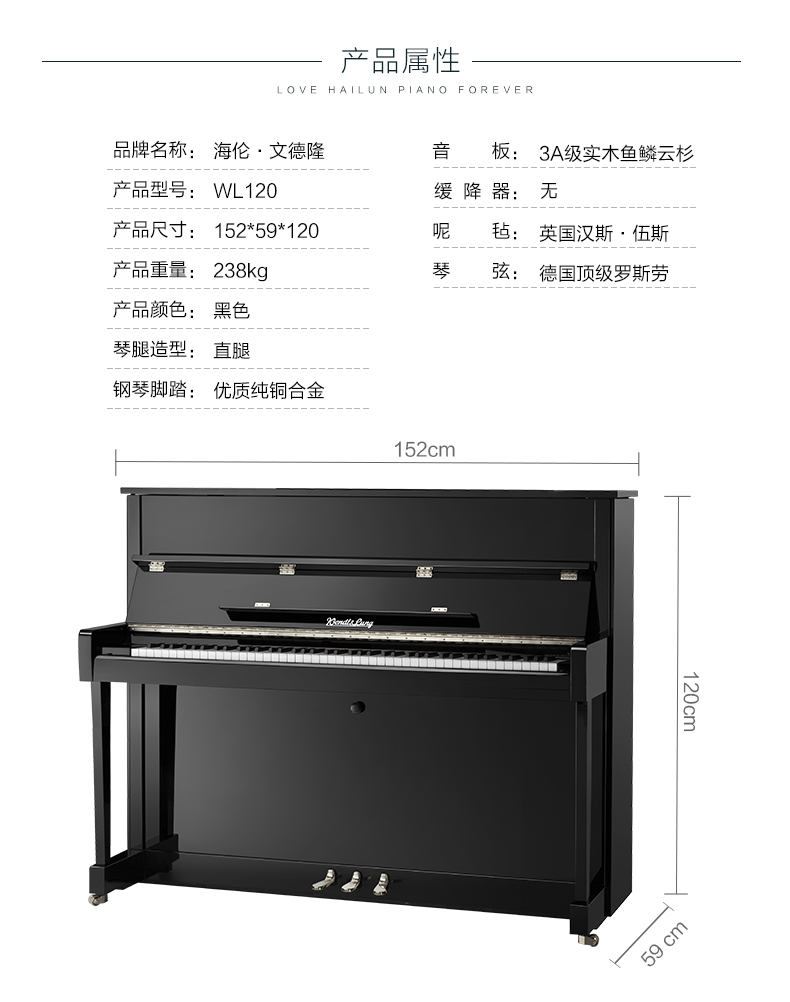 商品名称:海伦HAILUN文德隆WL120实木专业立式钢琴全新成人初学者钢琴正品