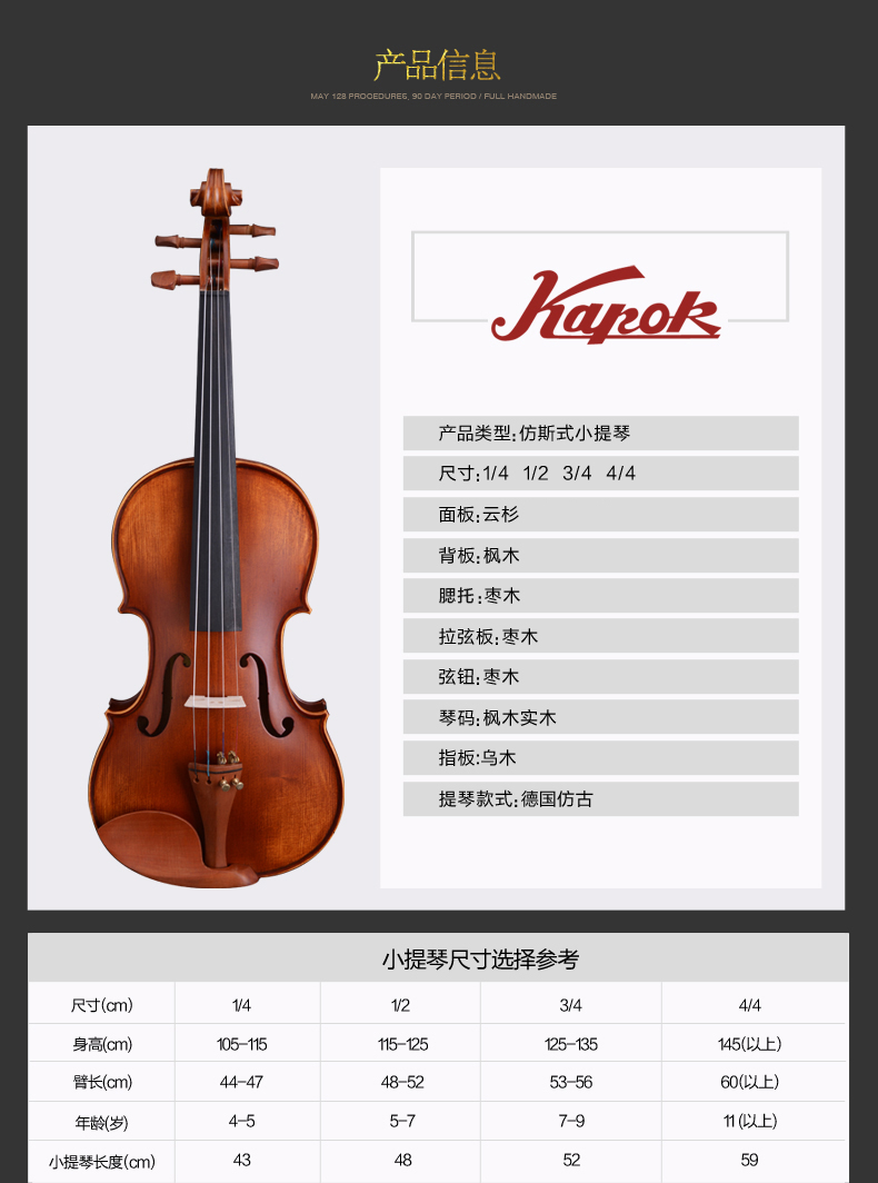 商品名称:kapok红棉手工实木虎纹小提琴儿童练习琴成人演奏小提琴初学琴