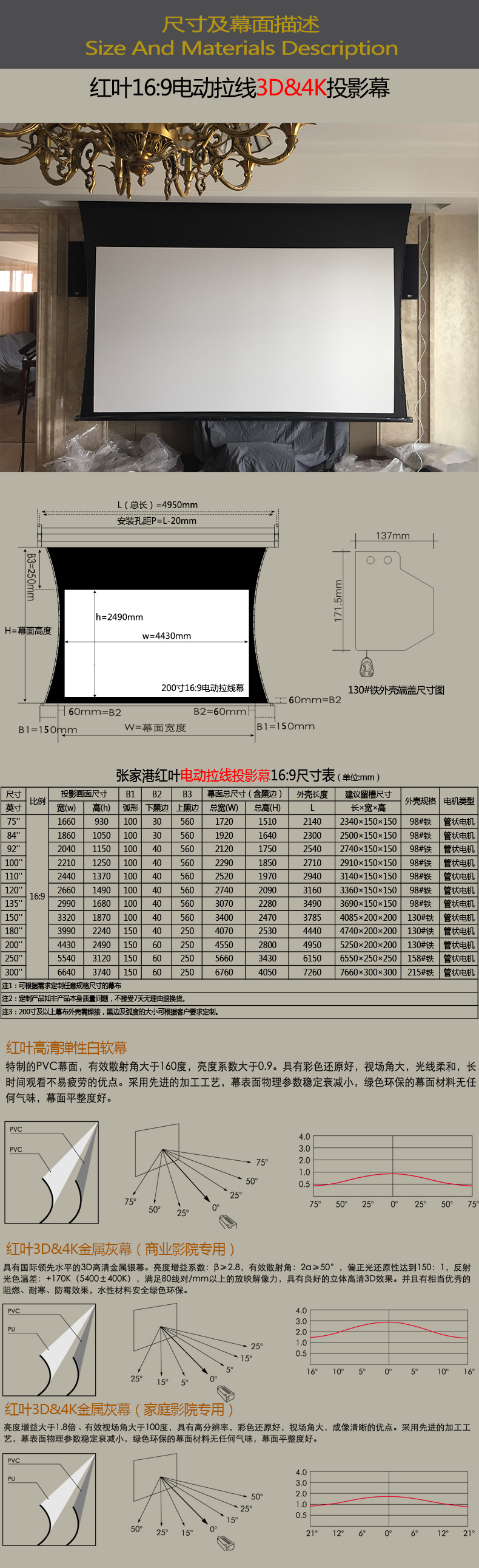 商品名称:张家港红叶电动拉线幕200寸16:9超高清3D&4K电动拉线白软幕遥控幕