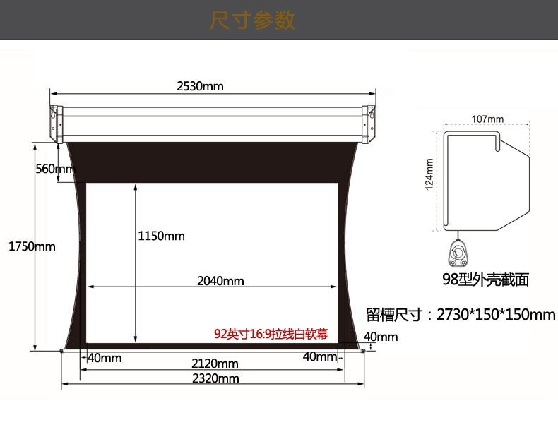 商品名称:张家港红叶电动拉线幕92寸16:9超高清3D&4K电动拉线白软幕