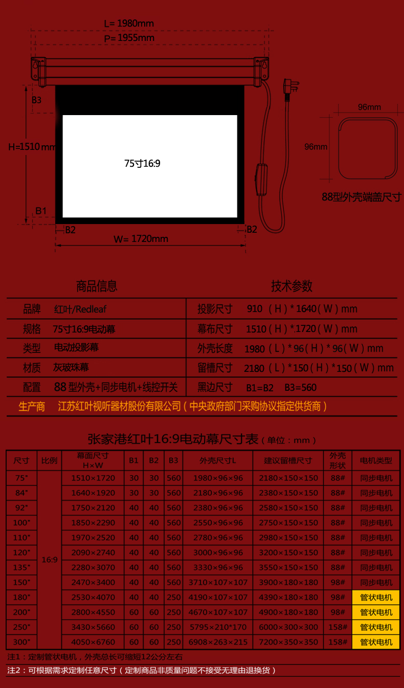 商品名称:张家港红叶电动投影仪幕布75寸16:9灰玻珠投影幕1080P高清3D幕布