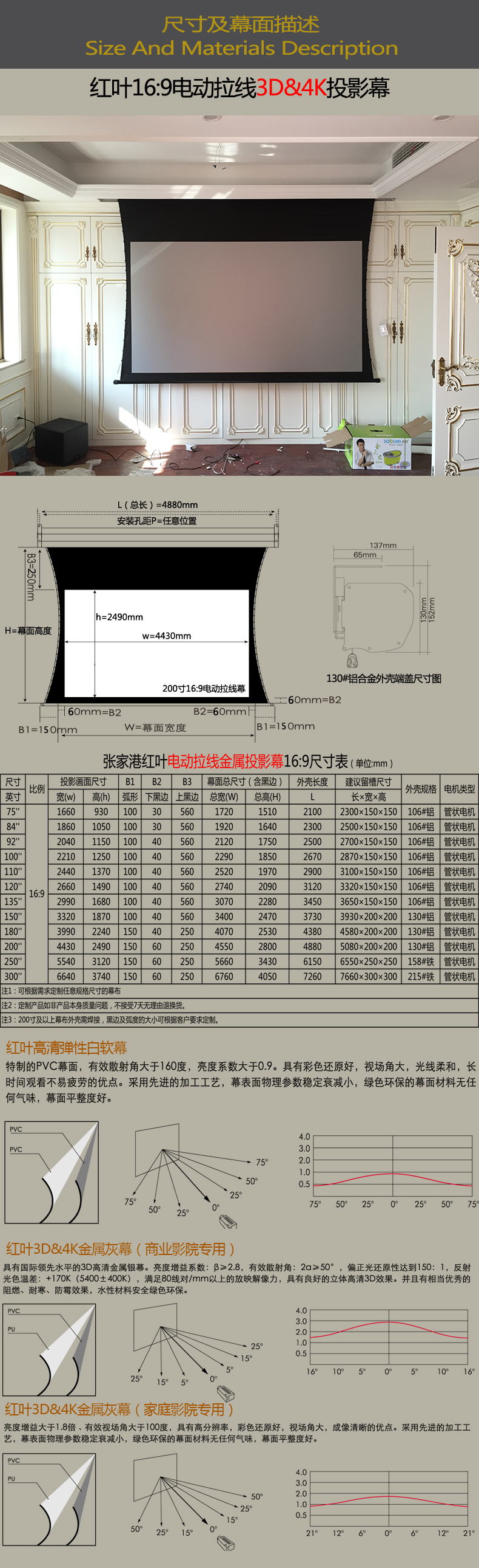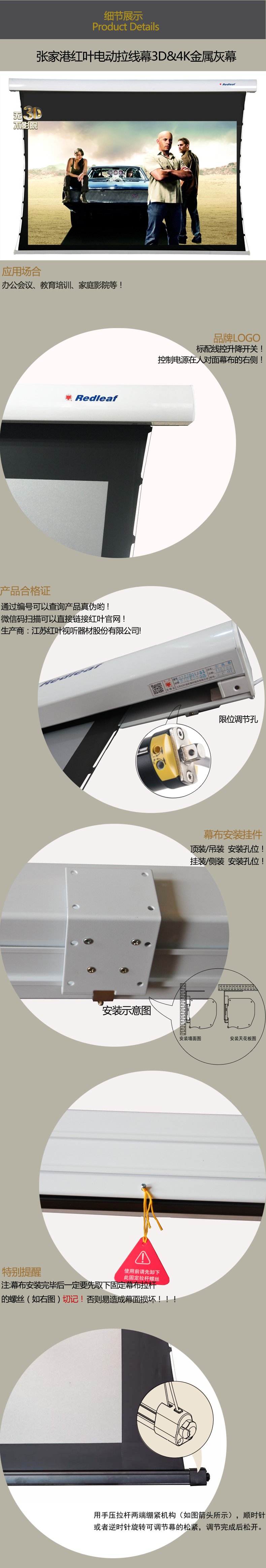 商品名称:张家港红叶电动拉线金属幕200寸16:9超高清3D&4K电动金属幕家用