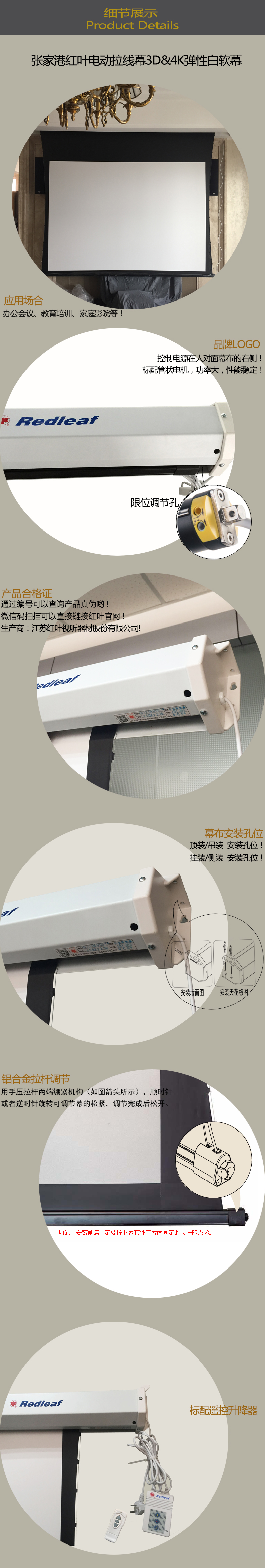 商品名称:张家港红叶电动拉线幕180寸16:9超高清3D&4K电动拉线白软幕遥控幕