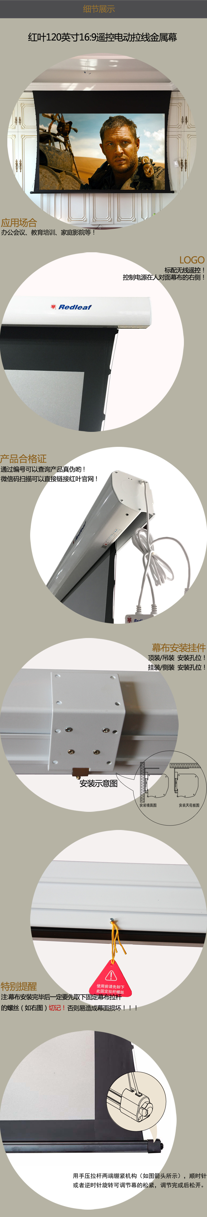 商品名称:张家港红叶电动拉线金属幕120寸16:9超高清3D&4K电动金属幕家用
