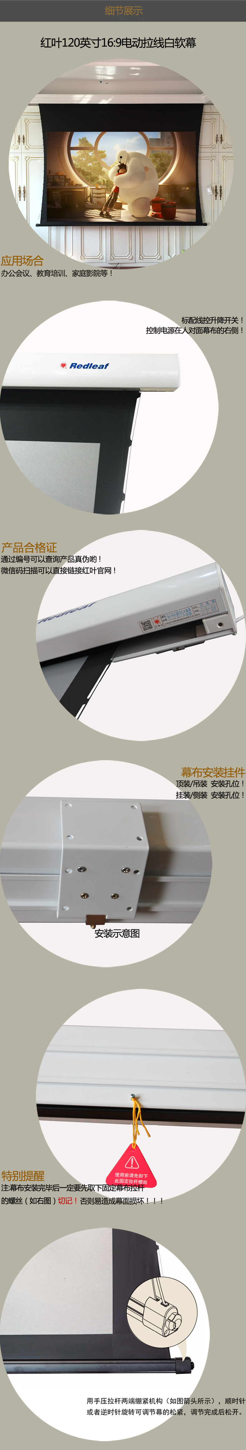 商品名称:张家港红叶电动拉线幕120寸16:9超高清3D&4K电动拉线白软幕遥控幕