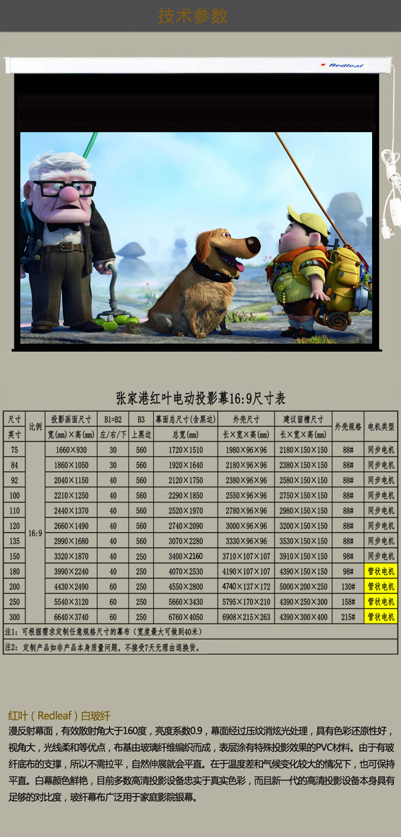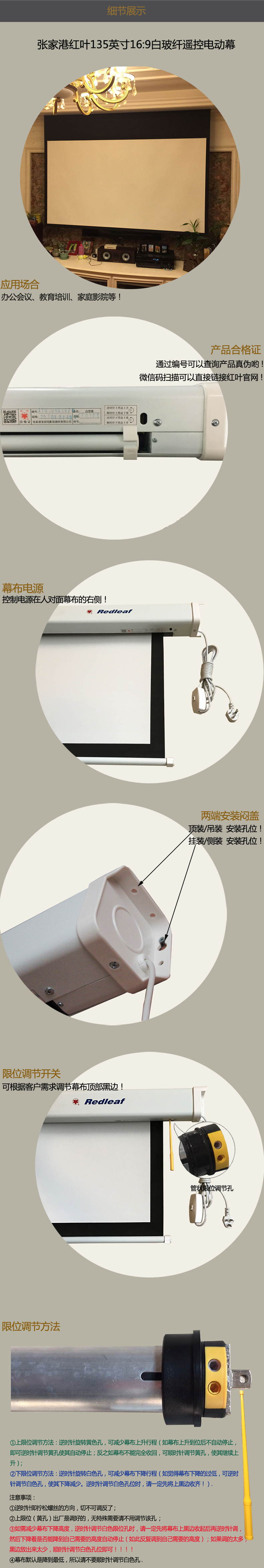 商品名称:张家港红叶电动投影幕133寸135寸16:9白玻纤幕灰玻纤高清3D投影幕