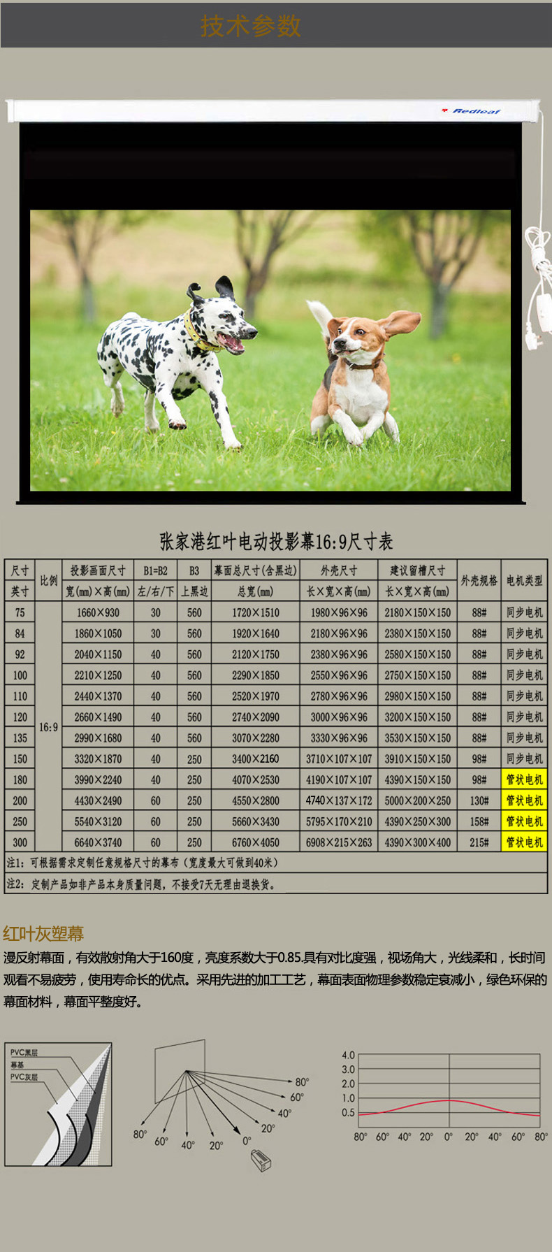 商品名称:张家港红叶电动投影幕92寸16:9灰塑高清1080P投影幕3D投影幕家用