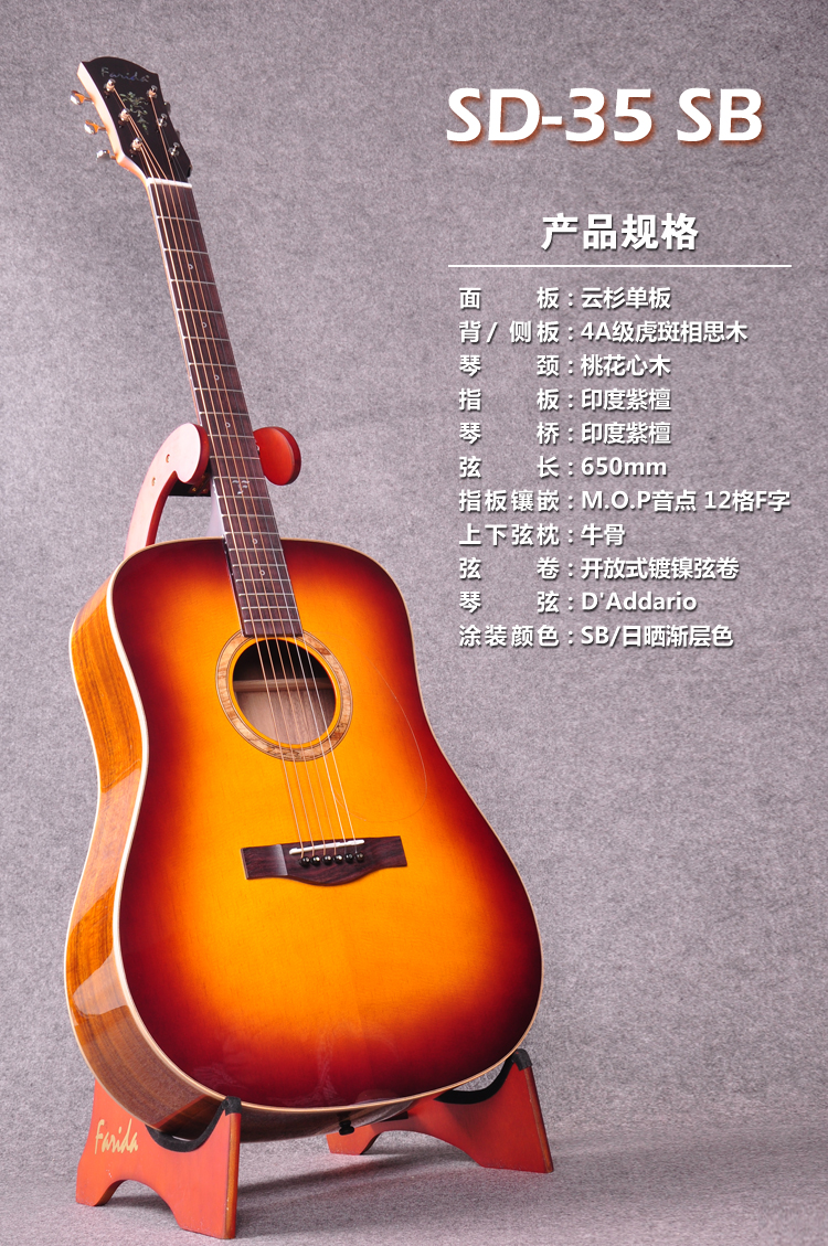 商品名称:官方新品 法丽达 Farida 高级面单 民谣吉他 SD-35 SB 送硬壳箱