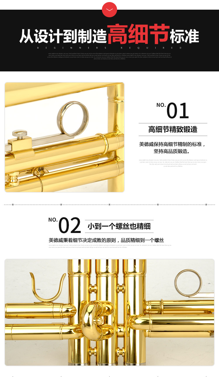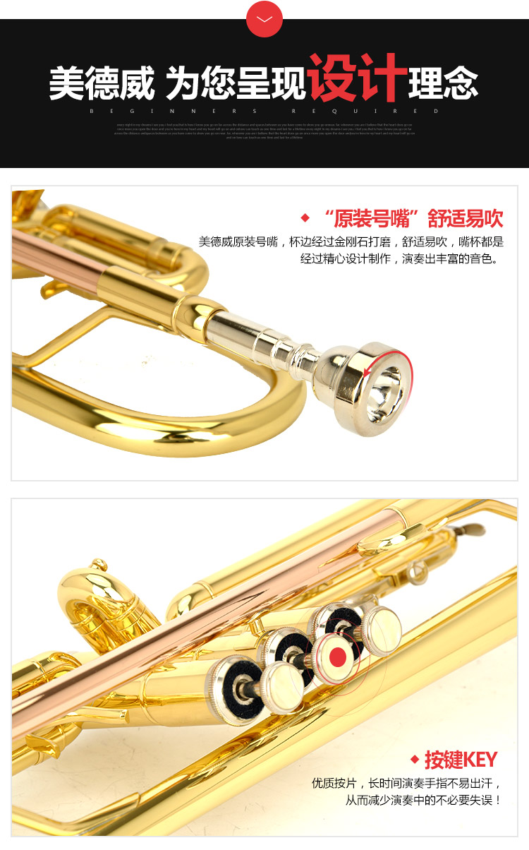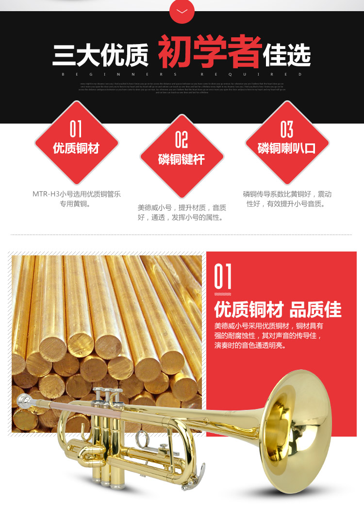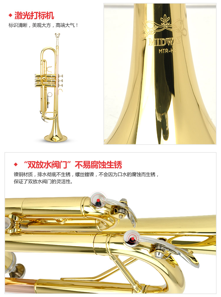 商品名称:小号乐器 演奏级 降B调小号 2年保修 赠包 美德威乐器 MTR-H3