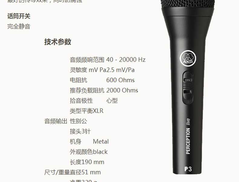 商品名称:AKG/爱科技 P3S 专业动圈麦克风家用K歌舞台演出乐队和声有线话筒