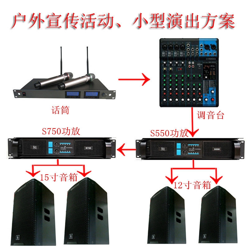 2只主音箱BH V15+2只补声音箱BH V12+1台主音功放BH S750+1台补声功放 BH S550+1台调音台 YAMAHA MG10XU+1套无线话筒安度ART-R2/T7S