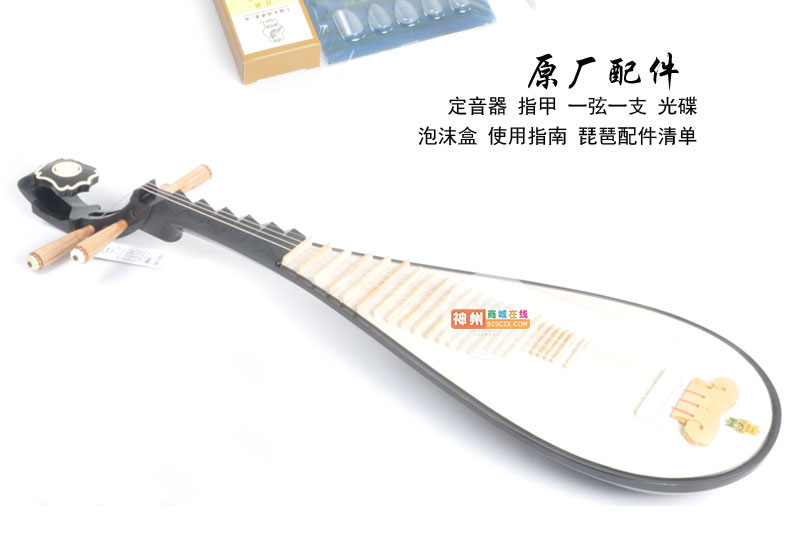 原包装配件:敦煌指甲1付,定音器,第一弦2只,琵琶使用说明一张。