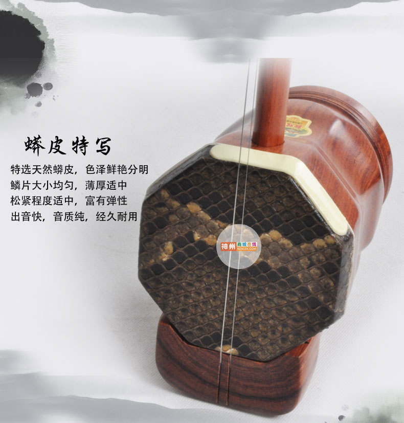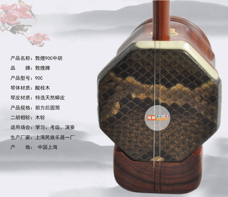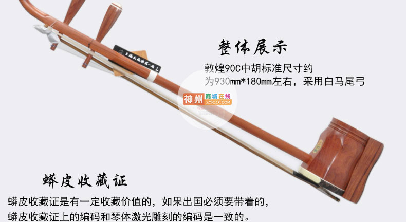 商品简介:敦煌90A中胡 货号:90A 材料:缅酸缅酸枝八角筒木轸 尺寸:930X180(4寸) 琴盒:人革盒