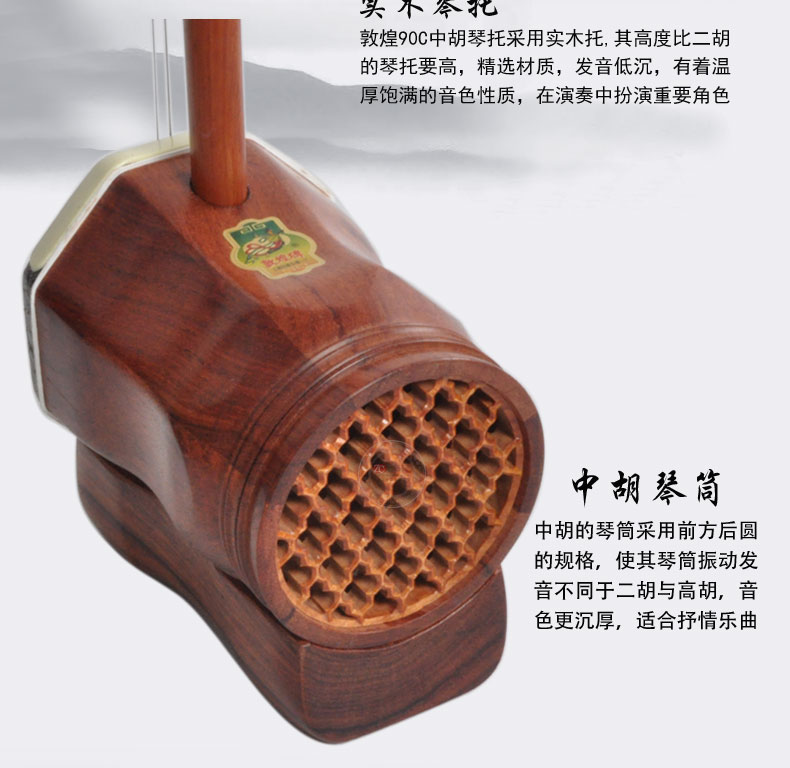 中胡是中音二胡的简称,定弦比二胡低一个纯四度或五度,音色浑厚,常用于合奏、伴奏或独奏,是民族乐队中的中音乐器,以弥补高低音之间的空隙,使整个乐队声音丰满。 敦煌牌中胡选材讲究,工艺精细,造型美观,演奏时手感舒适,以音灵敏,音色圆润,深受广大演奏者的喜爱。