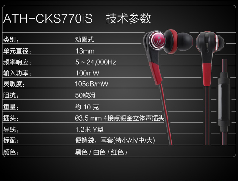 商品名称:Audio Technica/铁三角 ATH-CKS770IS 智能手机耳麦入耳式耳机