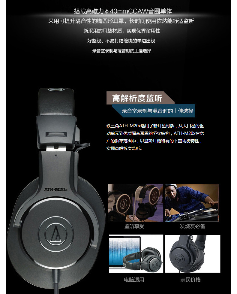 Audio Technica/铁三角 ATH-M20X 录音室可用 专业监听耳机