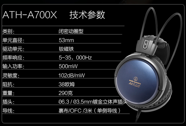 商品名称:Audio Technica/铁三角 ATH-A700X 艺术监听/密闭动圈型耳机