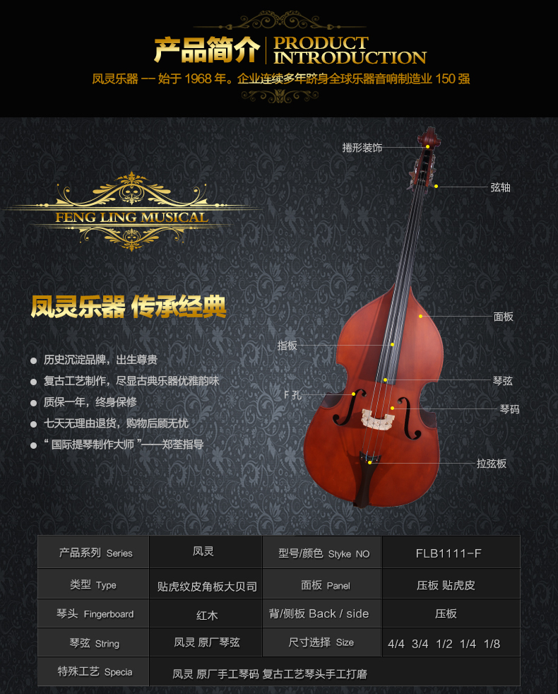 商品名称:凤灵正品FLB11F虎纹初学考级乐器夹板大贝司/低音大提琴/倍大提琴