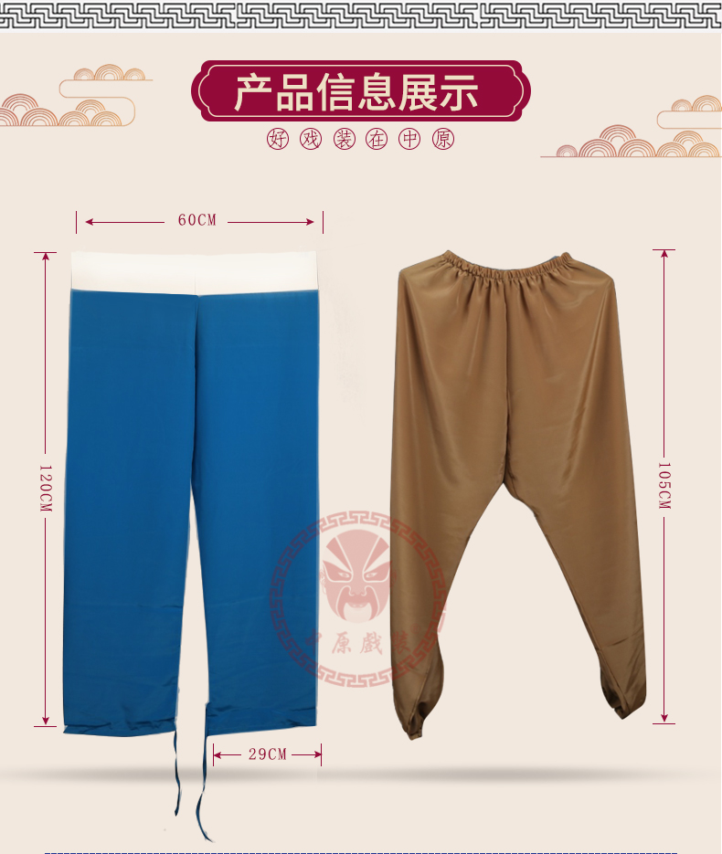 商品名称:中原戏装彩裤古装戏曲服装素彩裤戏剧小生练功裤古代男女灯笼裤