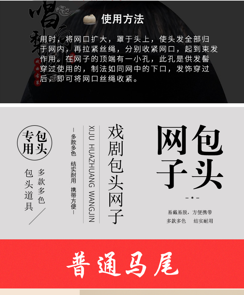 商品名称:中原戏装戏曲包头网子发网网巾胶丝加厚真马尾头发套戏京剧化妆品