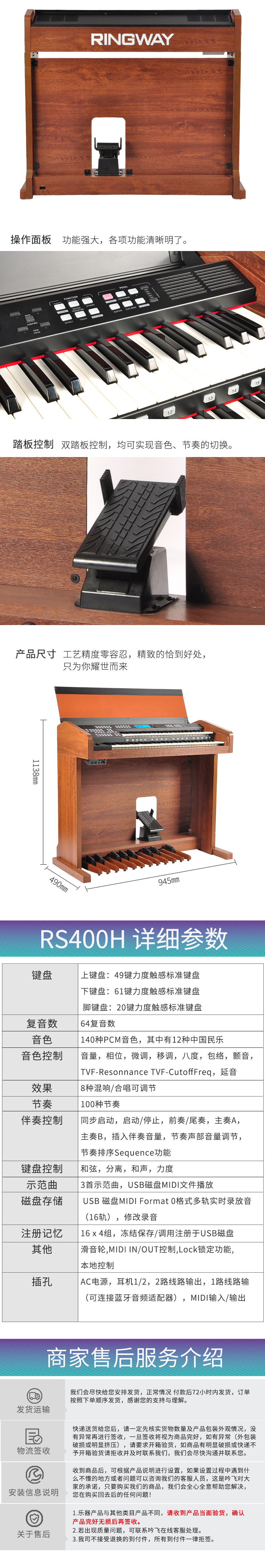 商品名称:Ringway吟飞电子管风琴 RS400H双排键 入门演奏儿童培训数码钢琴
