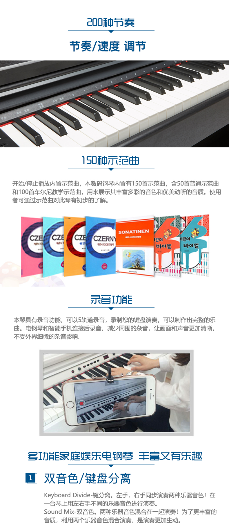 260种音色 200种节奏 150种示范曲 录音功能