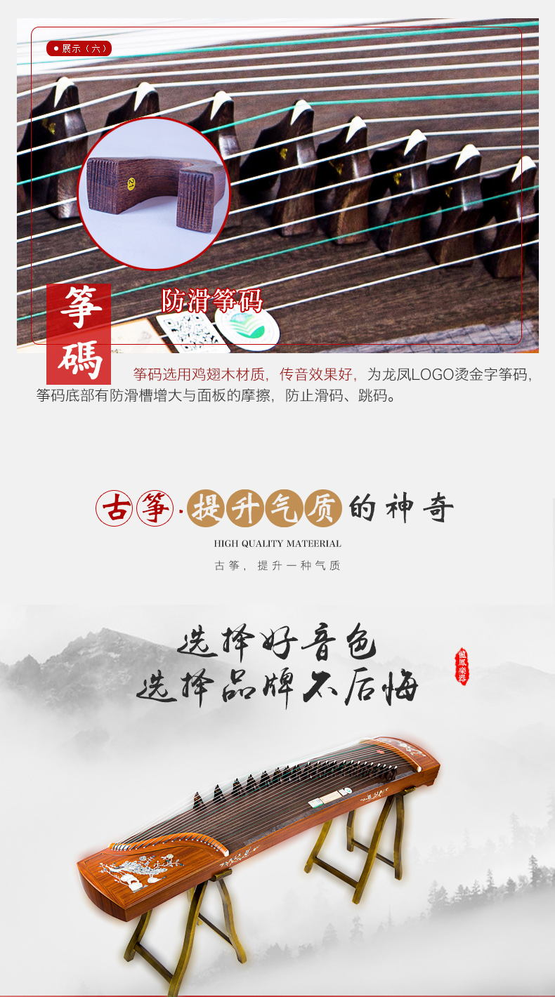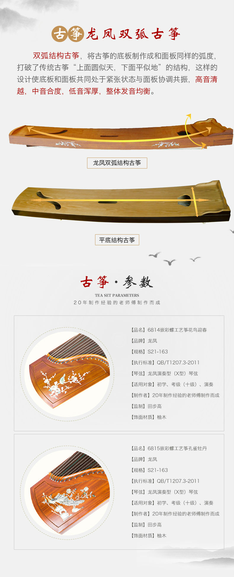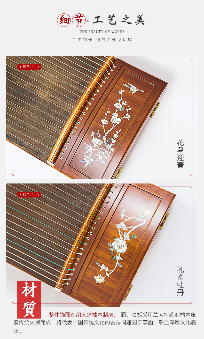 商品名称:龙凤古筝嵌彩螺6814花鸟迎春6815孔雀牡丹龙凤双弧古筝