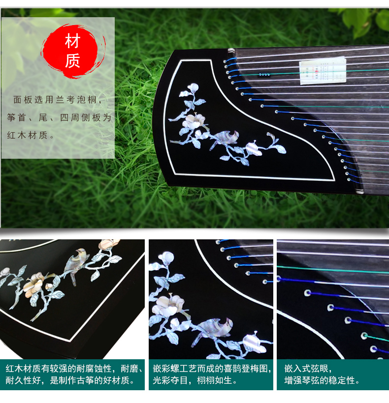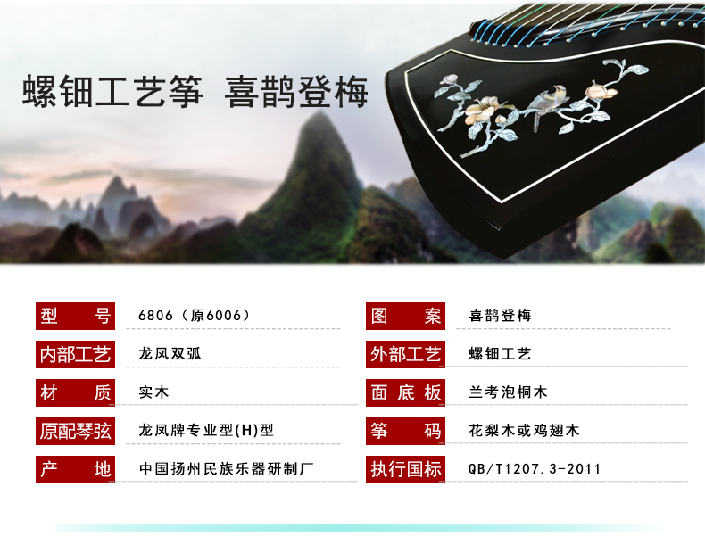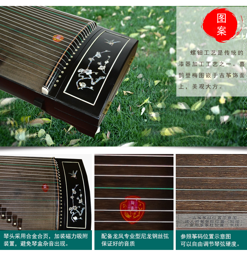 商品名称:龙凤品牌古筝厂家直销6806彩螺工艺筝喜鹊登梅古筝正品乐器