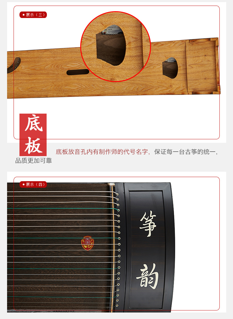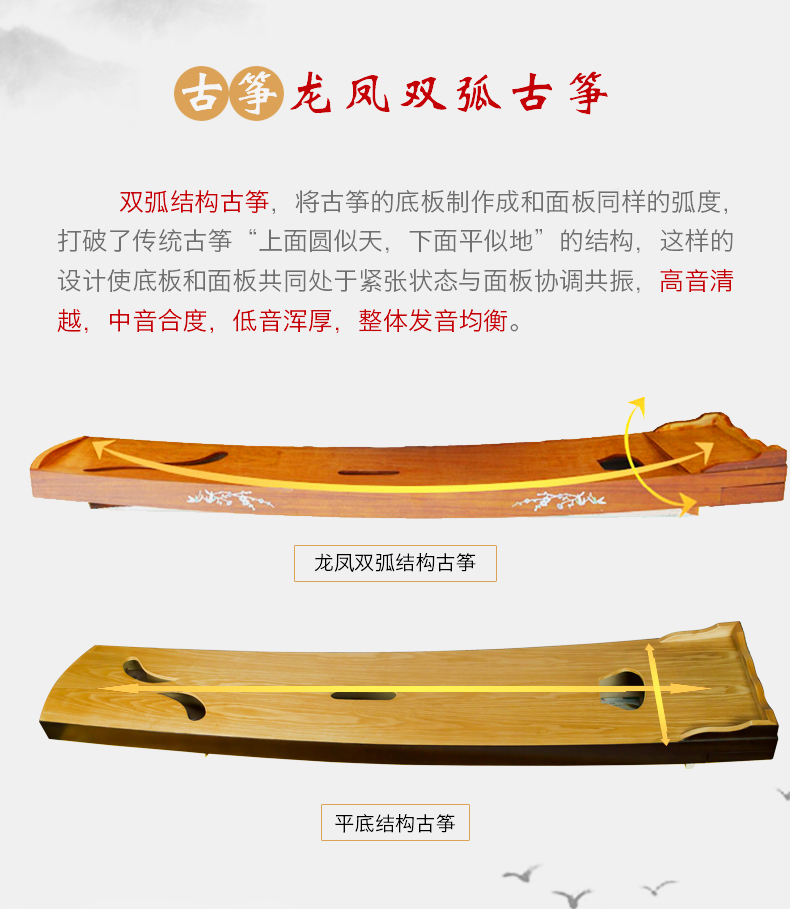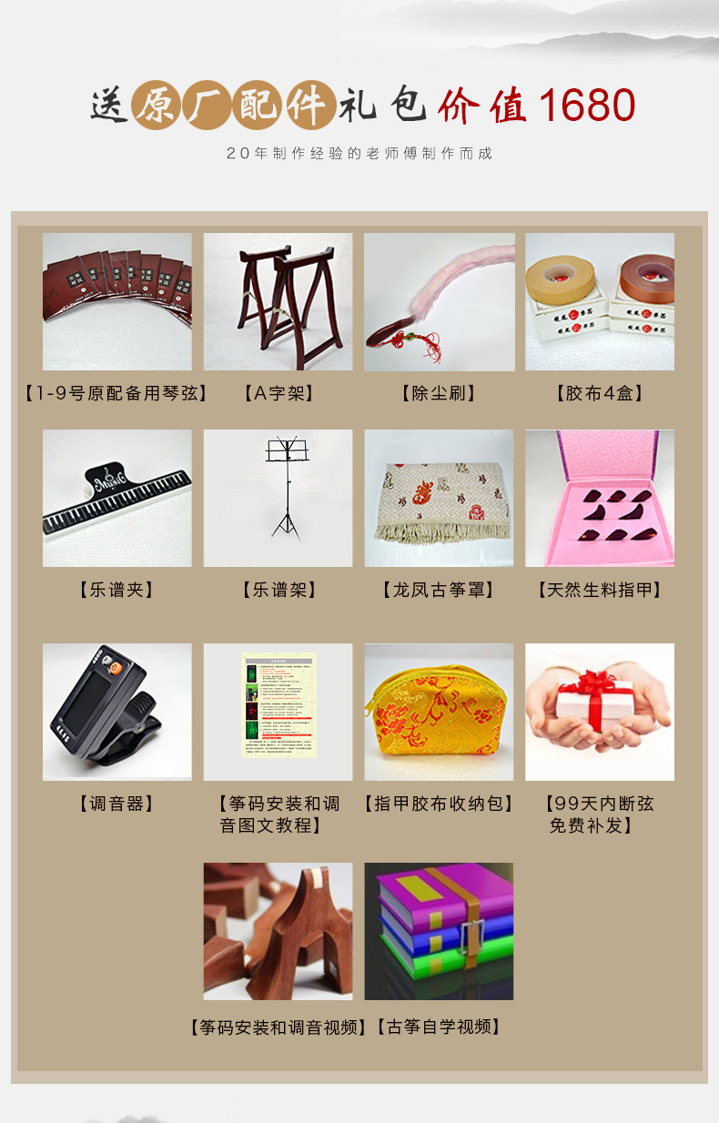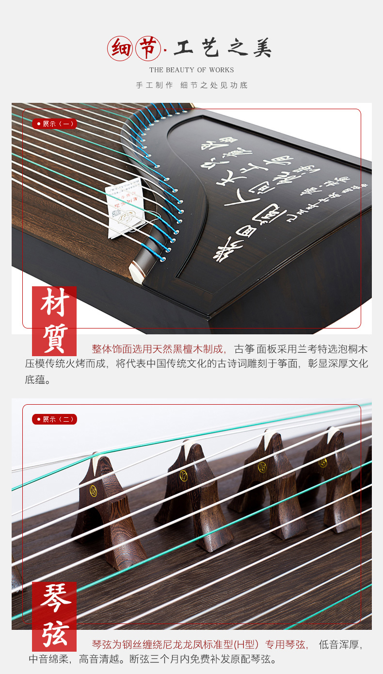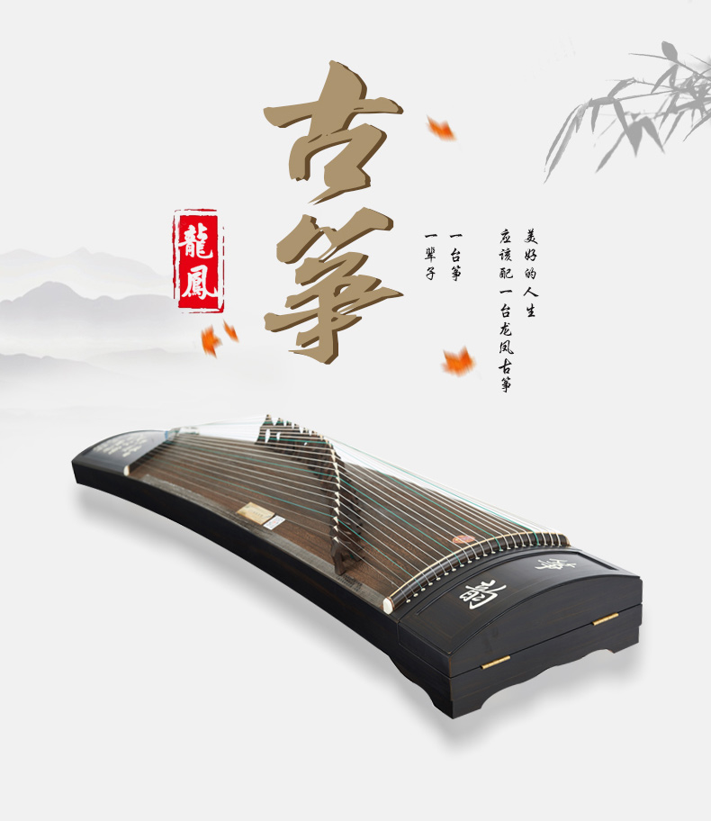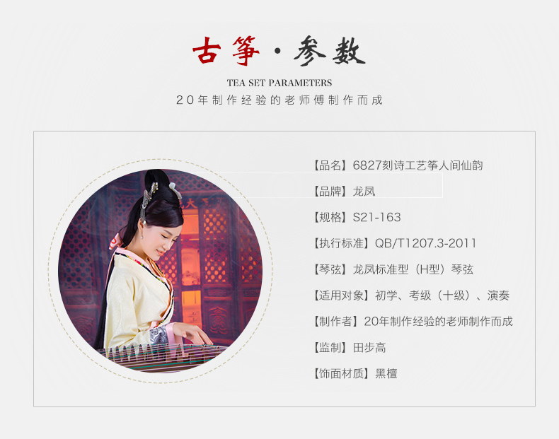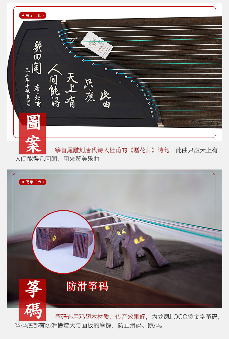 商品名称:龙凤品牌古筝6827刻诗工艺人间仙韵双弧古筝