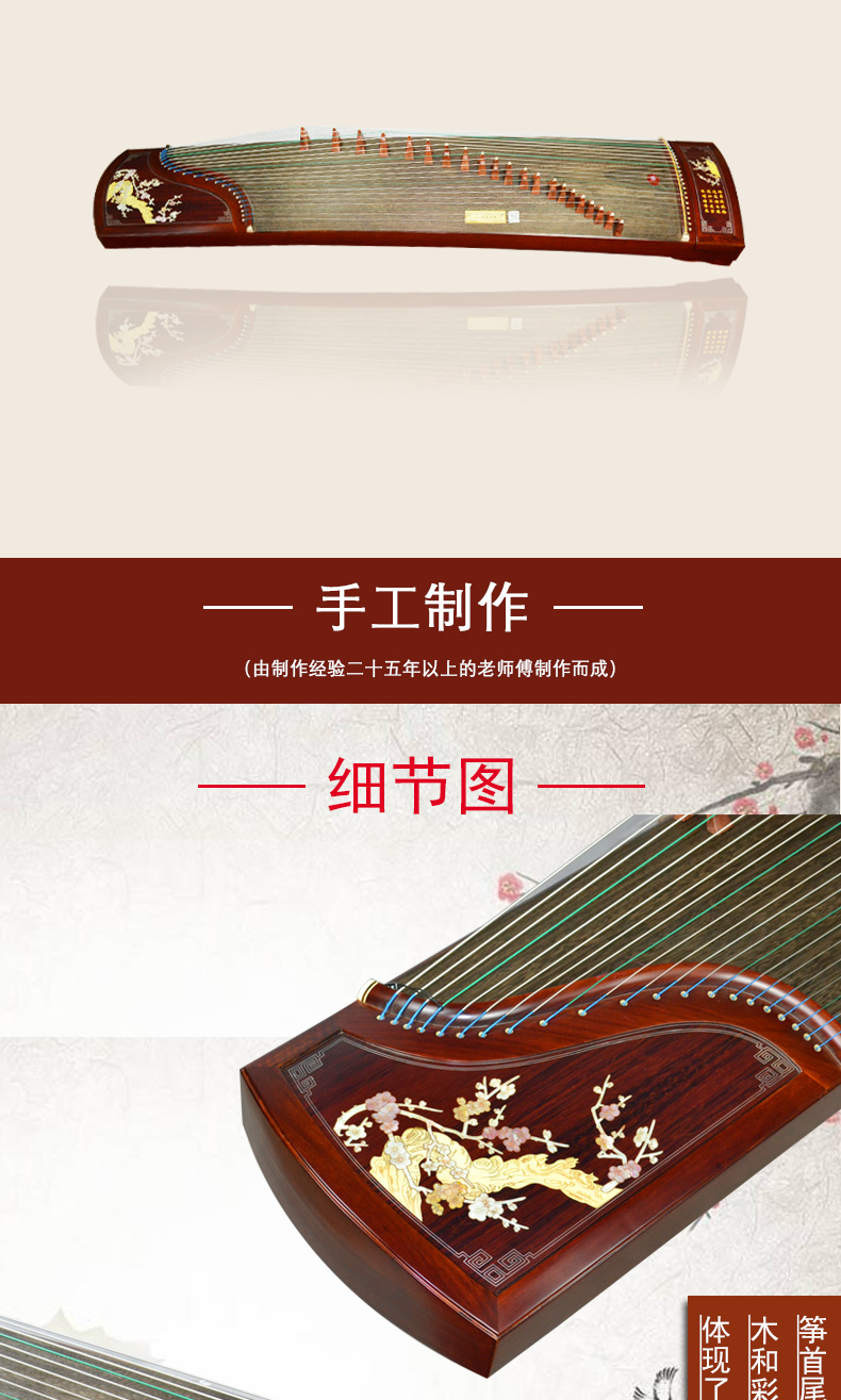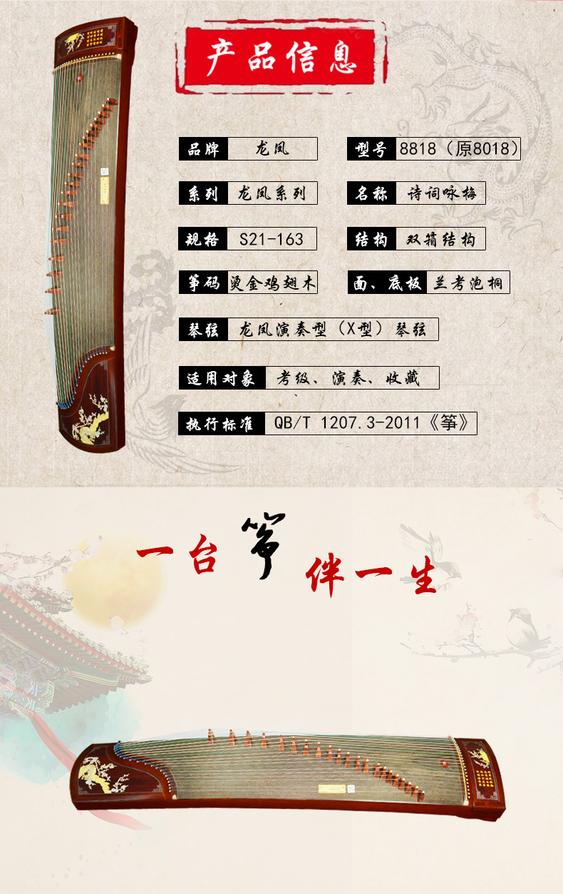 商品名称:龙凤8818原8018红檀嵌银丝诗词咏梅双箱结构古筝专业考级演奏筝