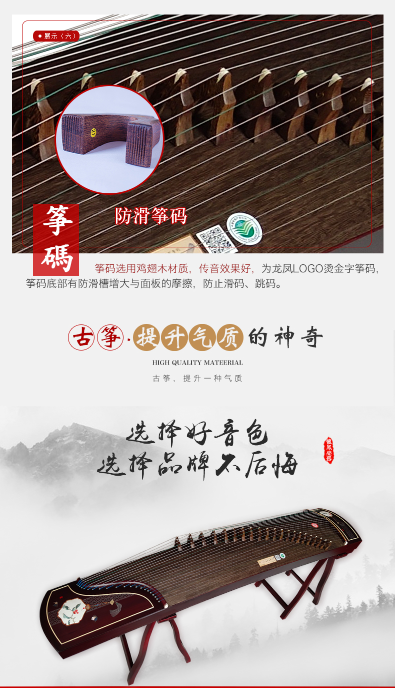 龙凤品牌古筝7003楠木贴雕清风弄竹双弧古筝