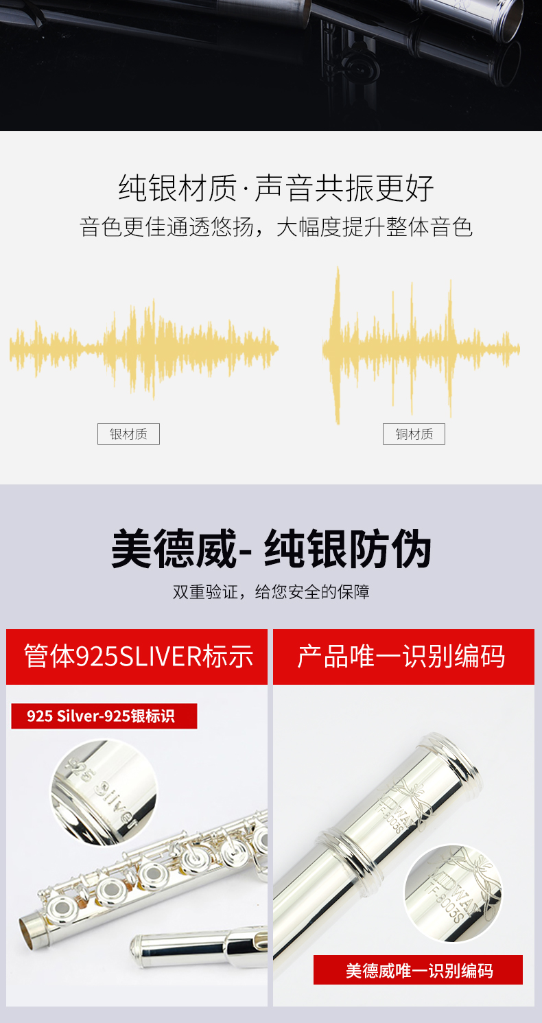 美德威 纯银长笛8003S 专业笛子 乐器正品 法式按键 17开孔长笛