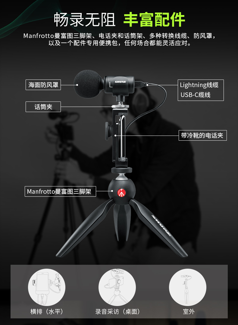 Shure/舒尔 mv88+电容便携式手机话筒唱歌麦克风直播采访录音