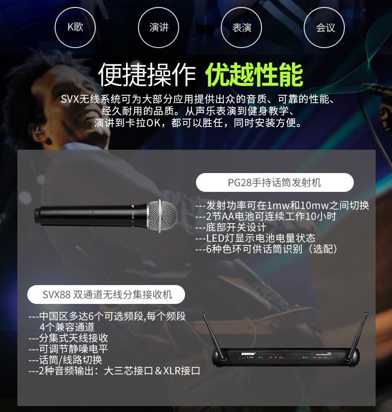 商品名称:Shure/舒尔 SVX288/PG28 一拖二无线话筒舞台演出家庭K歌麦克风