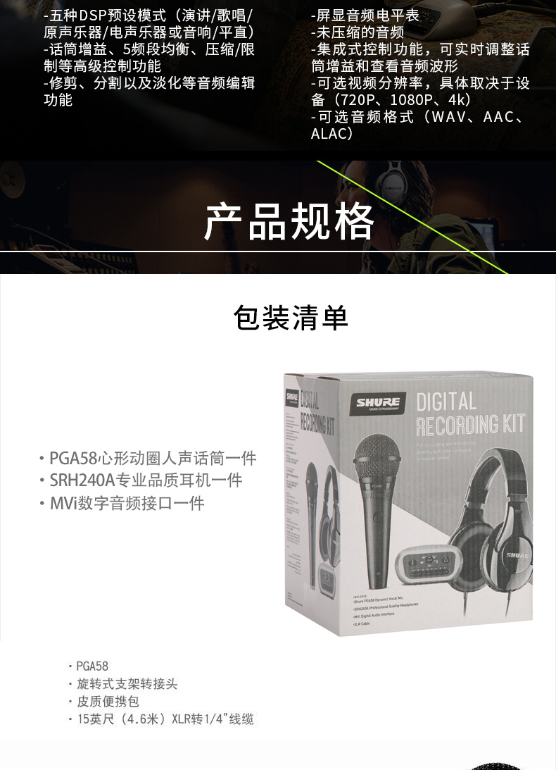 商品名称:Shure/舒尔 Digital Recording Kit 直播K歌话筒耳机数字录音套装
