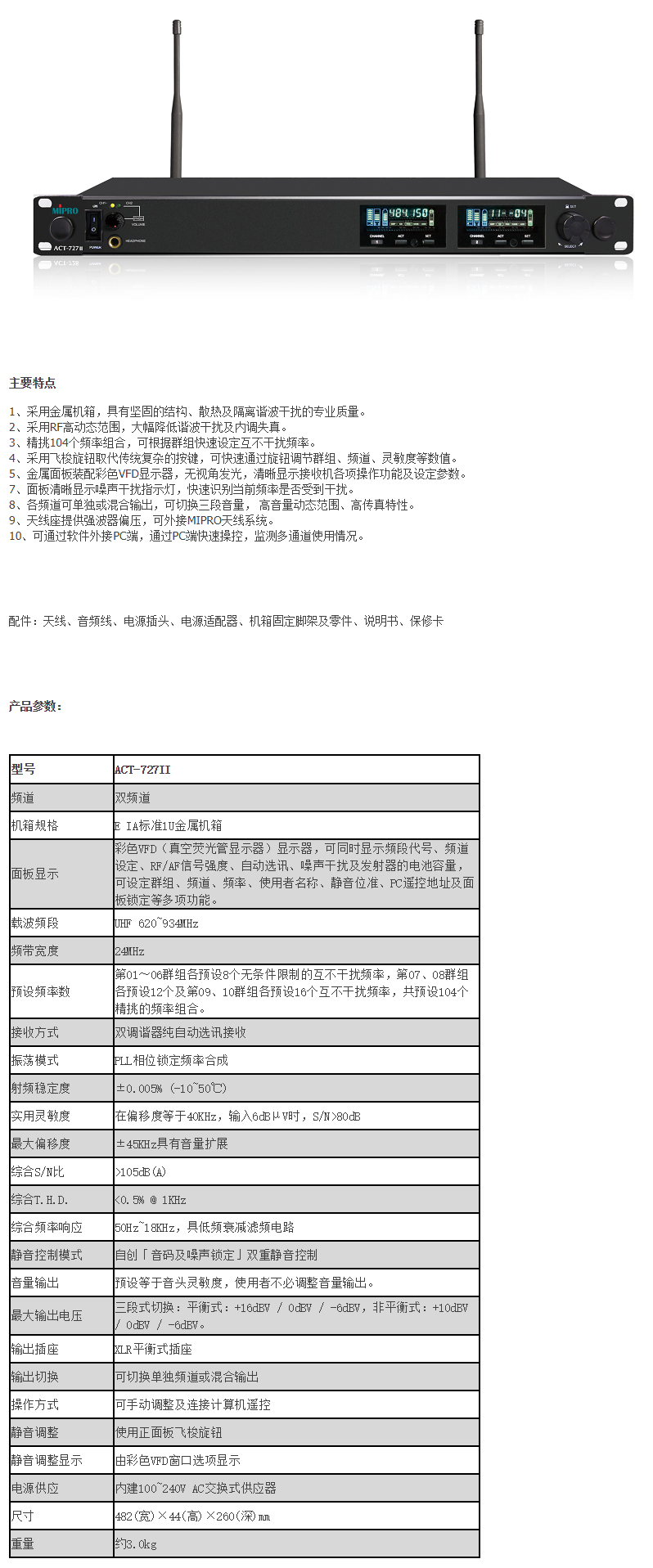 商品名称:MIPRO ACT-727II咪宝电容麦克风无线话筒一拖二K歌会议舞台演出