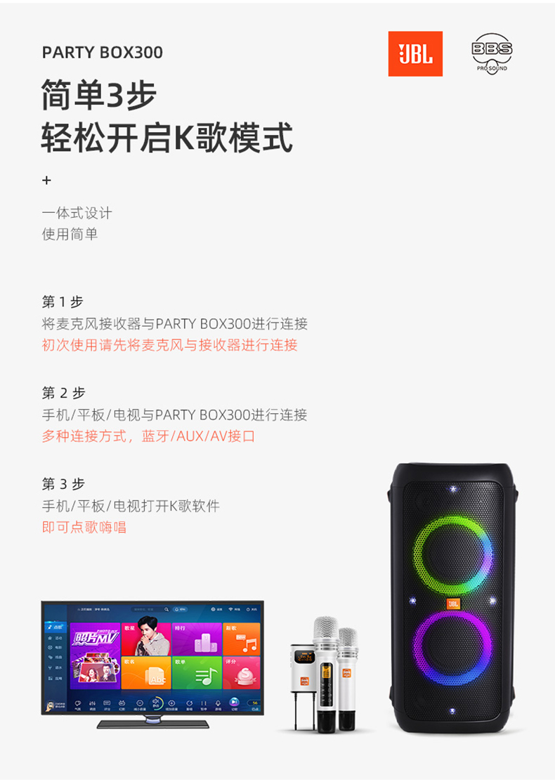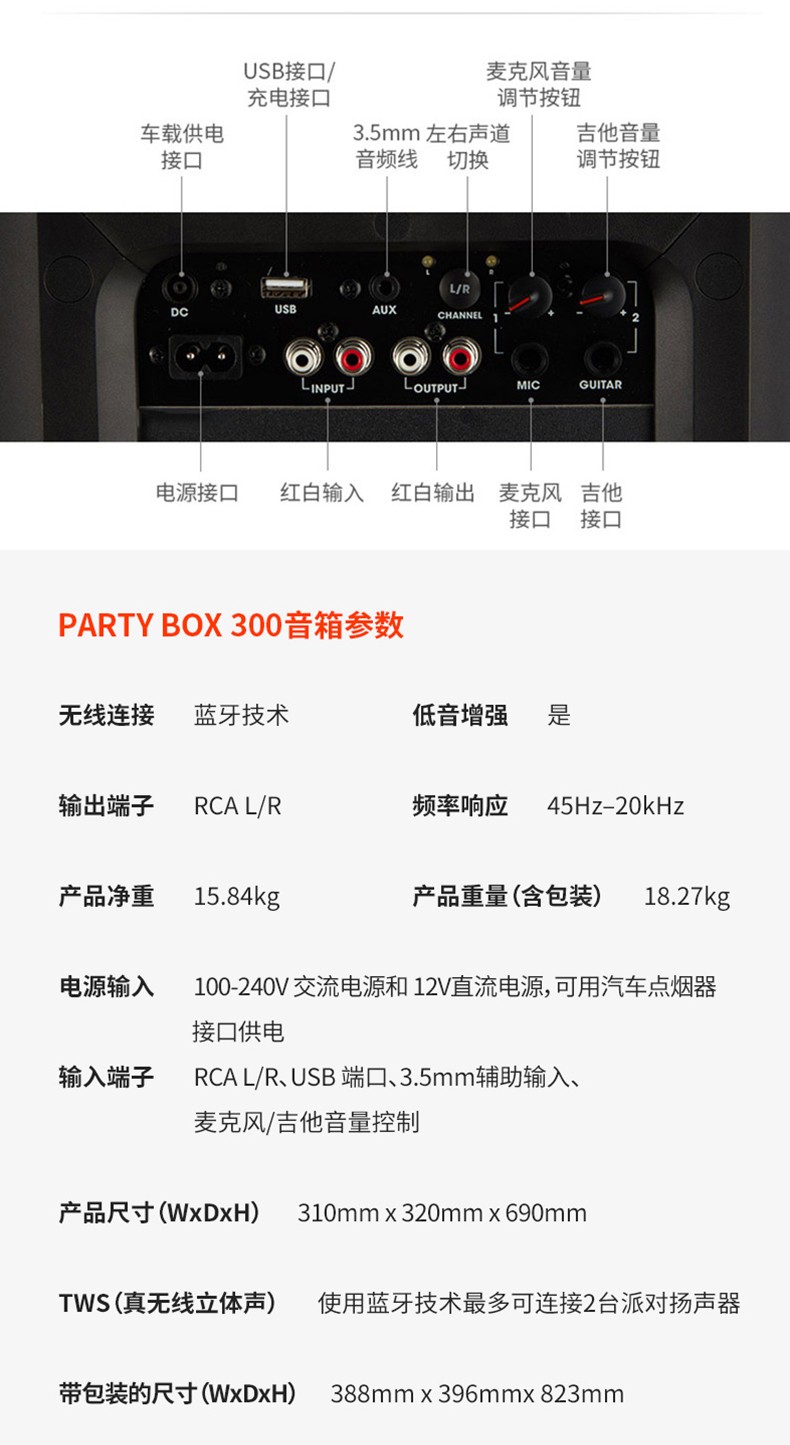 商品名称:JBL PARTYBOX300音响 音箱 家庭影院 家庭KTV卡拉OK套装 客厅音响蓝牙音箱