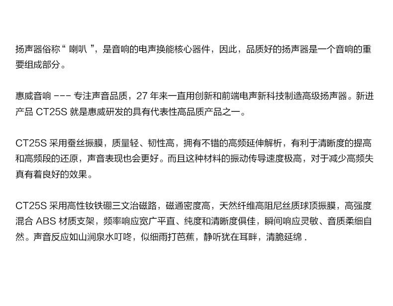 商品名称:HiVi惠威CT25S车载25mm丝膜球顶高音扬声器喇叭单元无损改装音响