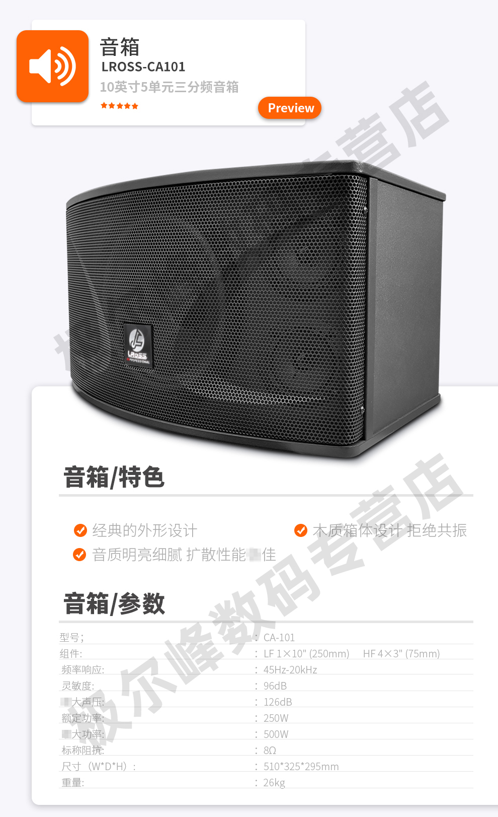 商品名称:LROSS CA101 10英寸卡拉OK包房音箱三分频五单元KTV包房音响 CA101 10英寸音响一对
