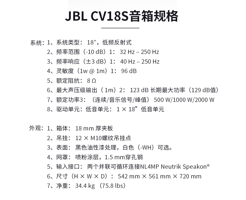商品名称:JBL CV18S 18英寸大功率 无源超低频音箱 专业级音箱 JBL CV18S 超低音音箱 一只