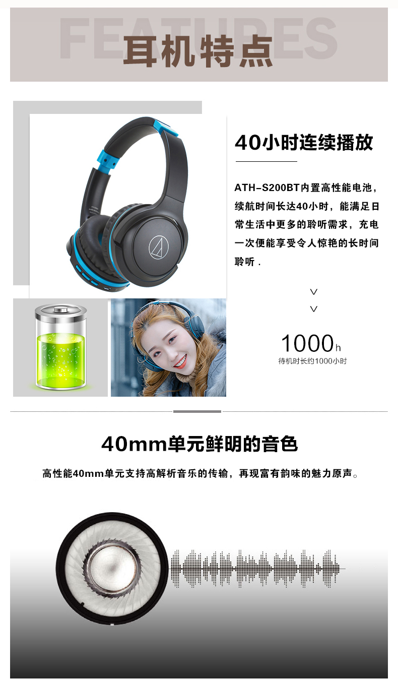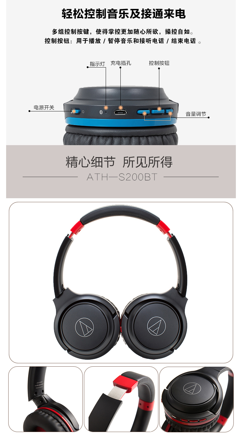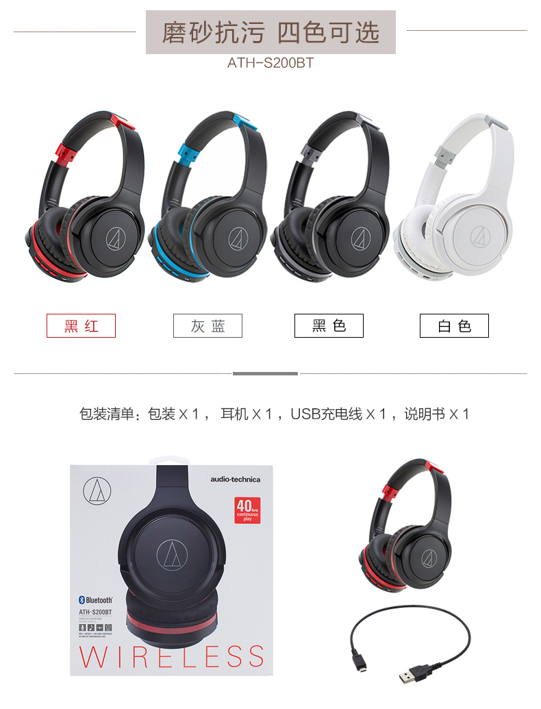 商品名称:Audio Technica/铁三角 ATH-S200BT 音乐头戴式耳麦无线蓝牙耳机